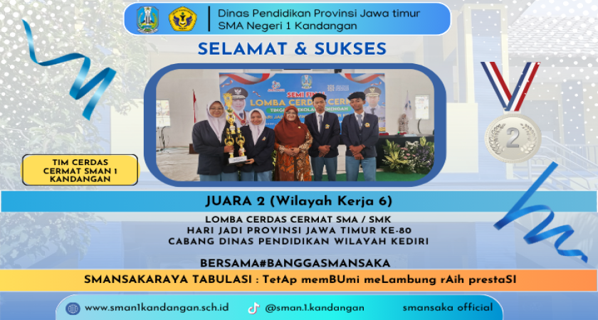 Tim Lomba Cerdas Cermat (LCC) SMA Negeri 1 Kandangan Kediri, menorehkan prestasi yang membanggakan di kancah akademik. Pada ajang LCC antar SMA/Sederajat yang digelar di SMA 5 Taruna Brawijaya Kediri, Jum'at (03/10/2025), tim ini berhasil melangkah hingga babak semifinal dan meraih gelar juara 2 wilayah kerja 6.